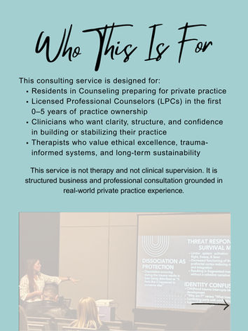 For Residents in Counseling or newly licensed clinicians, consultation can help you understand what to prepare for before stepping into private practice ownership, including ethical considerations, supervision needs, documentation habits, financial readiness, and professional identity development.
