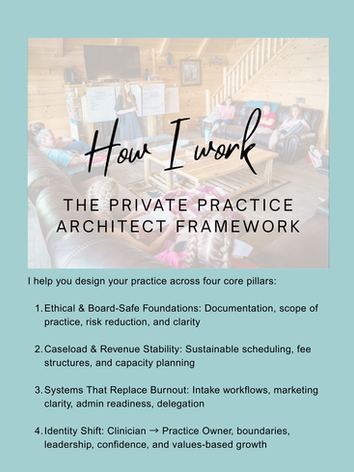 Private Practice Architect consultation is educational and advisory in nature. This service is not therapy, clinical supervision, legal advice, accounting advice, or a substitute for consultation with an attorney, CPA, insurance panel representative, or licensing board. Consultation does not create a therapeutic relationship or supervisory relationship unless separately contracted.